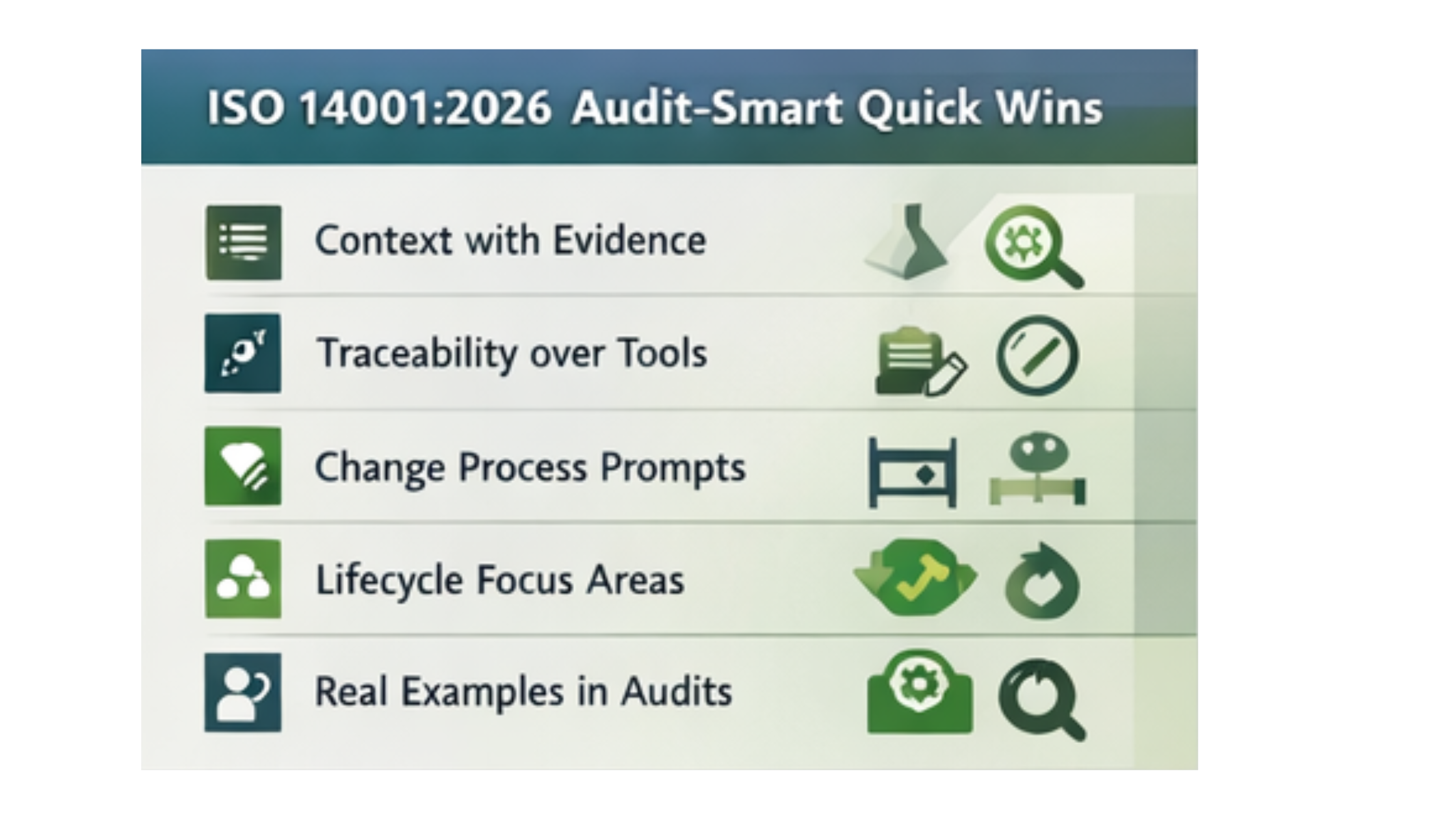 For organisations already operating a mature ISO 14001 system, the transition to the 2026 edition does not require structural upheaval. In practice, a few targeted actions often deliver most of the compliance and audit readiness benefits.